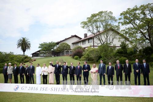 Thủ tướng Việt Nam Nguyễn Xuân Phúc (thứ 5, từ phải sang) và các nhà lãnh đạo tại Hội nghị thượng đỉnh G7 mở rộng ở Shima, tỉnh Mie ngày 27/5. Ảnh: AFP/TTXVN