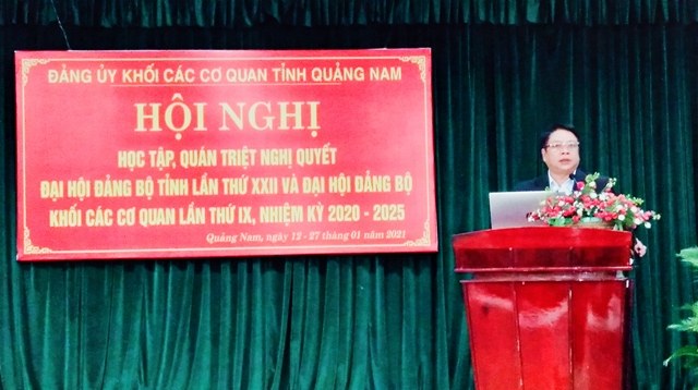 Qua hai ngày học tập (12 và 13/01), đại biểu được nghe các đồng chí Bùi Võ Quảng - Bí thư Đảng ủy Khối, Nguyễn Phước Sơn - Phó Bí thư Đảng ủy Khối quán triệt các chuyên đề về: (1) Giới thiệu tiêu đề Báo cáo chính trị (Chủ đề Đại hội). Khái quát về thành tựu và hạn chế, khuyết điểm trong việc triển khai thực hiện Nghị quyết Đại hội đại biểu Đảng bộ tỉnh lần thứ XXI, nhiệm kỳ 2015 - 2020; mục tiêu, nhiệm vụ trọng tâm giai đoạn 2020 - 2025, tầm nhìn đến năm 2030; (2) Tăng cường xây dựng Đảng và hệ thống chính trị trong sạch, vững mạnh; phát huy sức mạnh khối đại đoàn kết toàn dân, góp phần xây dựng Quảng Nam trở thành tỉnh phát triển khá của cả nước vào năm 2030; (3) Tiếp tục thực hiện 03 nhiệm vụ đột phá chiến lược gắn với đổi mới mô hình tăng trưởng, cơ cấu lại nền kinh tế của tỉnh, huy động và sử dụng hiệu quả mọi nguồn lực xây dựng Quảng Nam phát triển nhanh, bền vững trong giai đoạn 2020 - 2025; (4) Những giải pháp xây dựng và phát triển văn hóa, con người, đảm bảo an sinh xã hội, góp phần xây dựng Quảng Nam trở thành tỉnh khá của cả nước vào năm 2030; (5) Công tác đảm bảo quốc phòng, an ninh, nội chính, phòng chống tham nhũng, cải cách tư pháp và công tác đối ngoại; (6) Đổi mới và nâng cao năng lực lãnh đạo, sức chiến đấu của tổ chức cơ sở Đảng và chất lượng đội ngũ cán bộ đảng viên. Đẩy mạnh cải cách hành chính, nâng cao đạo đức công vụ và văn hóa công sở. Phát huy dân chủ, giữ vững kỷ cương, đoàn kết, nêu gương của cán bộ, đảng viên (của Đảng bộ Khối).