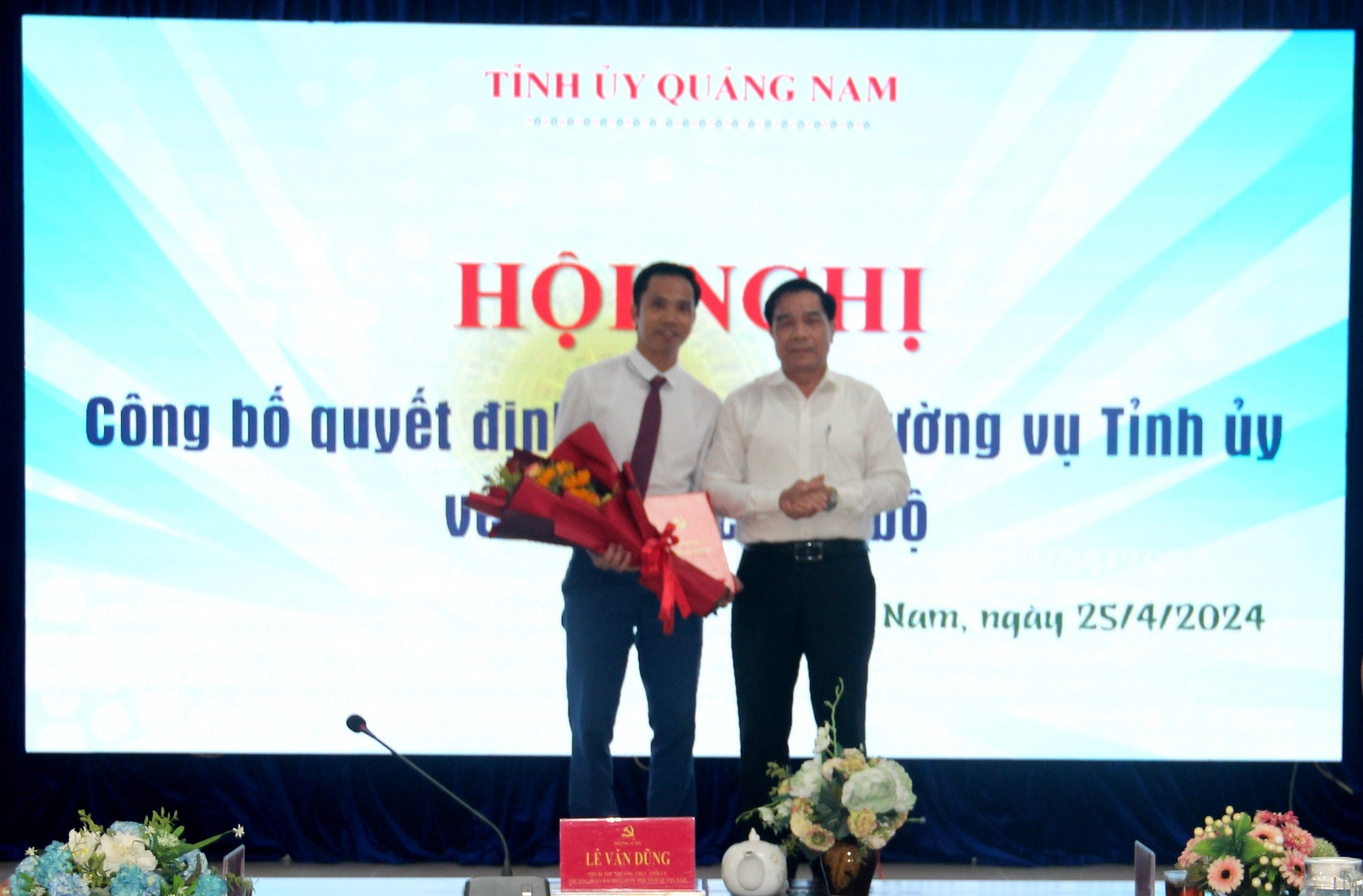 Thay mặt Thường trực Tỉnh ủy, đồng chí Lê Văn Dũng – Phó Bí thư Thường trực Tỉnh ủy, Trưởng Đoàn ĐBQH tỉnh trao Quyết định và tặng hoa chúc mừng và giao nhiệm vụ đồng chí Nguyễn Hữu Thiên – Phó Trưởng Ban Tuyên giáo Tỉnh ủy.