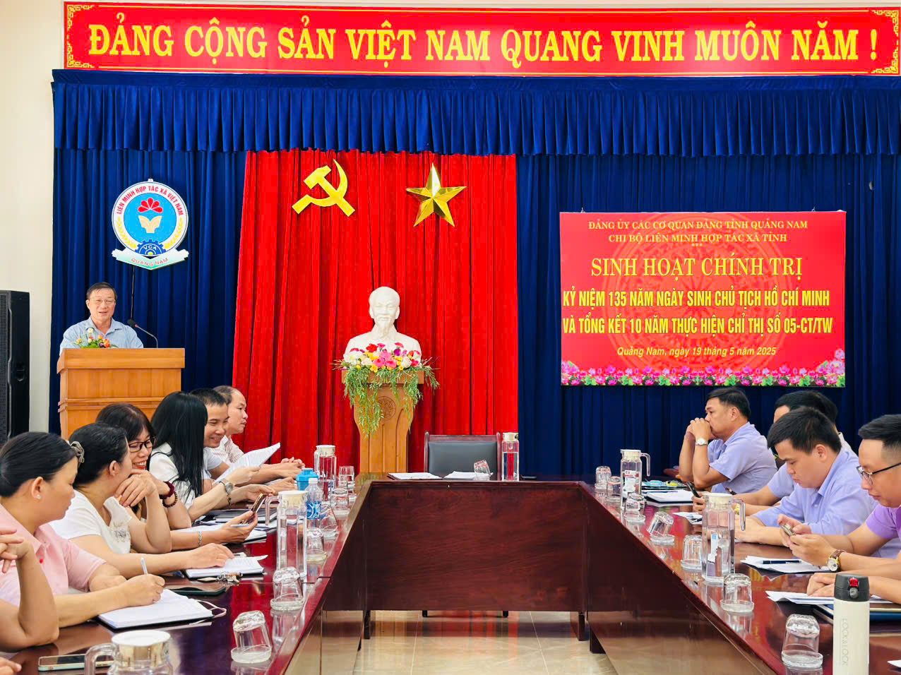Buổi sinh hoạt được tổ chức với sự tham dự đầy đủ của các đồng chí đảng viên trong chi bộ và toàn thể cán bộ, người lao động cơ quan. Tại buổi sinh hoạt, đồng chí Lê Ngọc Trung - Bí thư Chi bộ đã trình bày diễn văn kỷ niệm 135 năm ngày sinh Chủ tịch Hồ Chí Minh. Nội dung diễn văn đã nhấn mạnh tầm vóc lịch sử, tư tưởng cách mạng và đạo đức mẫu mực của Chủ tịch Hồ Chí Minh, đồng thời khẳng định vai trò dẫn dắt của tư tưởng Hồ Chí Minh trong công cuộc đổi mới và phát triển kinh tế tập thể, hợp tác xã tại địa phương.
