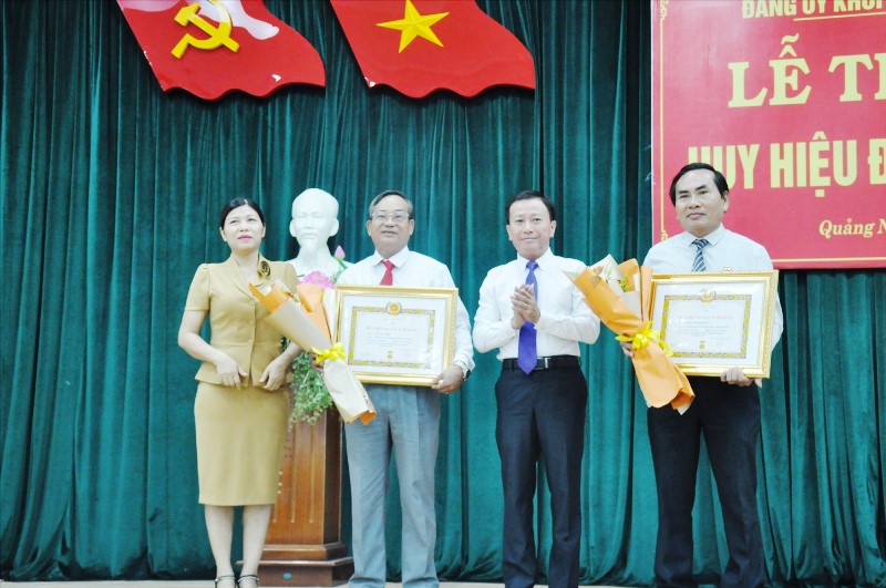Đc Thái Bình-Tỉnh ủy viên, Bí thư Đảng ủy Khối và đồng chí Nguyễn Xuân Đức-Phó Bí thư Đảng ủy Khối trao tặng Huy hiệu 30 năm tuổi Đảng và hoa chúc mừng các đảng viên