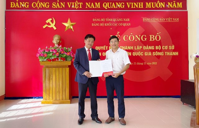 Tại buổi lễ, đồng chí Phan Đức Thấn-UVBTV, Trưởng Ban Tổ chức Đảng ủy Khối đã công bố Quyết định số 424-QĐ/ĐUK, ngày 7 tháng 11 năm 2022 của Ban Thường vụ Đảng ủy Khối các cơ quan tỉnh Quảng Nam về việc thành lập Đảng bộ cơ sở Ban Quản lý vườn quốc gia Sông Thanh. Đảng bộ Ban Quản lý vườn quốc gia Sông Thanh được thành lập có 89 đảng viên, trong đó 16 đảng viên là viên chức, 73 đảng viên là hợp đồng chuyên trách bảo vệ rừng.