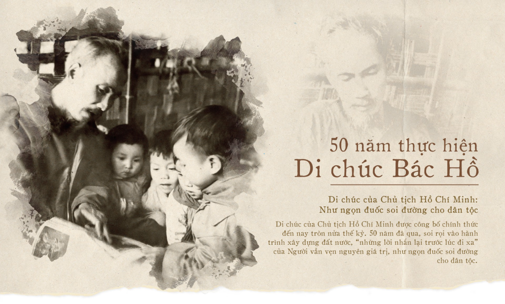 Sáng rõ tầm nhìn thời đại và vẹn nguyên giá trị định hướng, 50 năm sau khi Chủ tịch Hồ Chí Minh đi xa, Di chúc của Người vẫn là những chỉ dẫn quý báu, động lực tinh thần vô giá giúp toàn Đảng, toàn quân, toàn dân ta vượt qua khó khăn, tận dụng thời cơ, đối diện thách thức để xây dựng và bảo vệ Tổ quốc Việt Nam xã hội chủ nghĩa phát triển bền vững. Trong 50 năm qua, toàn Đảng, toàn quân, toàn dân đã đoàn kết, ra sức phấn đấu thực hiện Di chúc của Người; đã nhận thức sâu sắc những điều Người dặn dò, gửi gắm là vô cùng hệ trọng đối với sự nghiệp cách mạng và vận mệnh của dân tộc Việt Nam. Những trăn trở của Người, điều tâm nguyện từ trái tim, trí tuệ của Người đã và đang được nỗ lực thực hiện bởi những con người Việt Nam tin Đảng, tin Bác kính yêu và giàu lòng yêu nước.