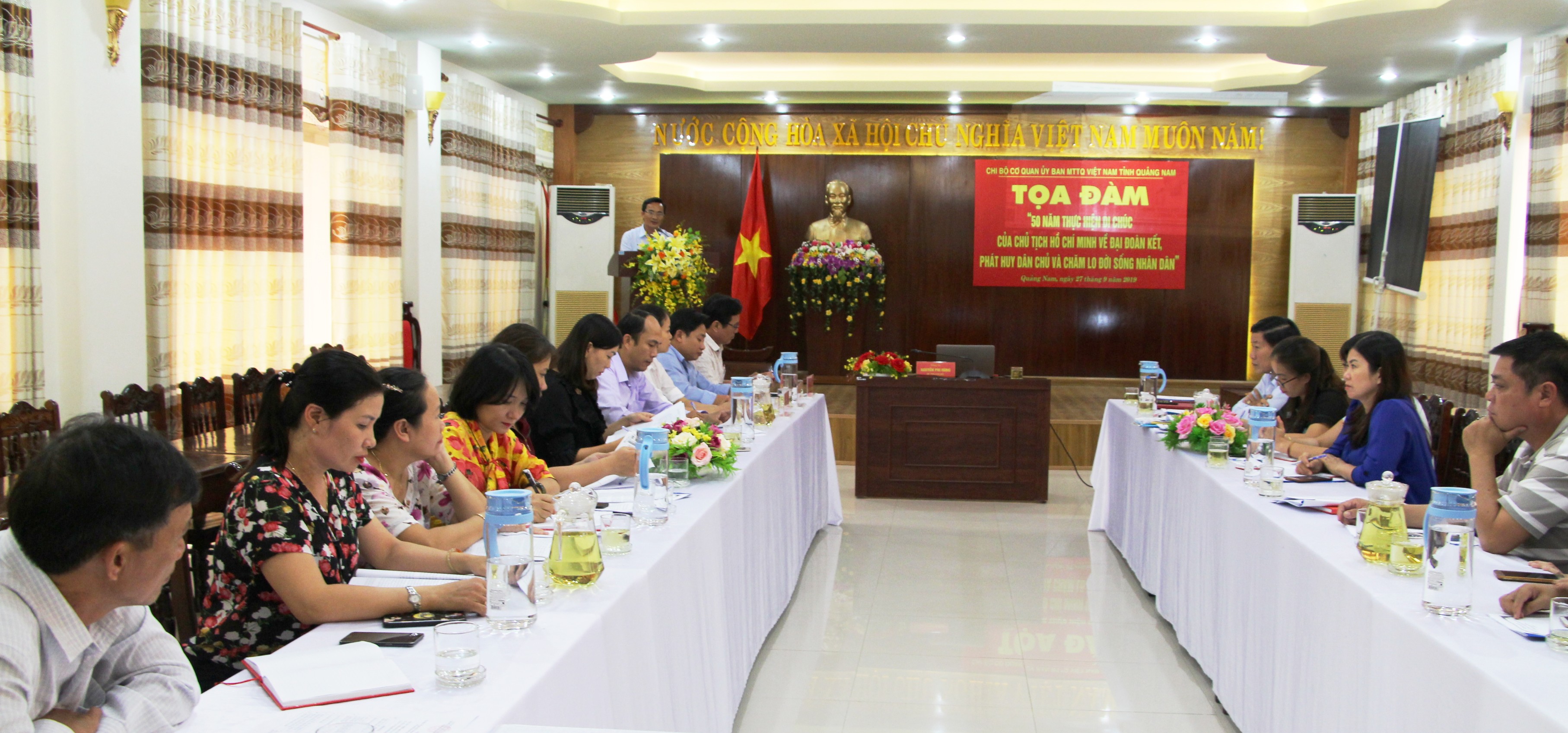 Tại buổi tọa đàm, các đại biểu và toàn thể cán bộ, đảng viên, đoàn viên cơ quan nghe đồng chí Đỗ Văn Bình - Phó Trưởng phòng Tuyên truyền - Báo chí - Xuất bản (Ban Tuyên giáo Tỉnh ủy) báo cáo chuyên đề những nội dung, giá trị cốt lõi trong Di chúc của Chủ tịch Hồ Chí Minh về đại đoàn kết, phát huy dân chủ và chăm lo đời sống Nhân dân; xem phim tư liệu công bố bản Di chúc vào tháng 9/1969 của đồng chí Lê Duẩn, cố Bí thư Thứ nhất Ban Chấp hành Trung ương Đảng Cộng sản Việt Nam.