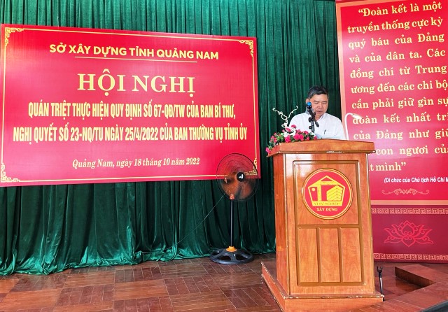 Tại hội nghị, các đại biểu được nghe đồng chí Nguyễn Phú-Bí thư Đảng ủy, giám đốc Sở Xây dựng đã quán triệt, thực hiện Quy định số 67-QĐ/TW ngày 02/6/2022 của Ban Bí thư về về chức năng, nhiệm vụ, quyền hạn, tổ chức bộ máy, chế độ làm việc, quan hệ công tác của Ban Chỉ đạo phòng, chống tham nhũng, tiêu cực tỉnh, thành phố trực thuộc Trung ương; Nghị quyết số 23-NQ/TU ngày 25/4/2022 của Ban Thường vụ Tỉnh ủy Quảng Nam và Quy chế làm việc của Ban Chỉ đạo phòng, chống tham nhũng, tiêu cực tỉnh.