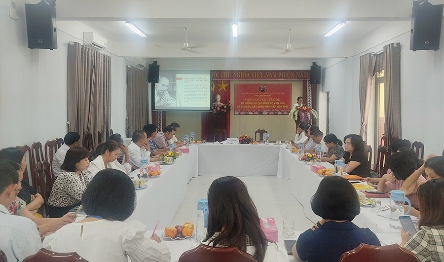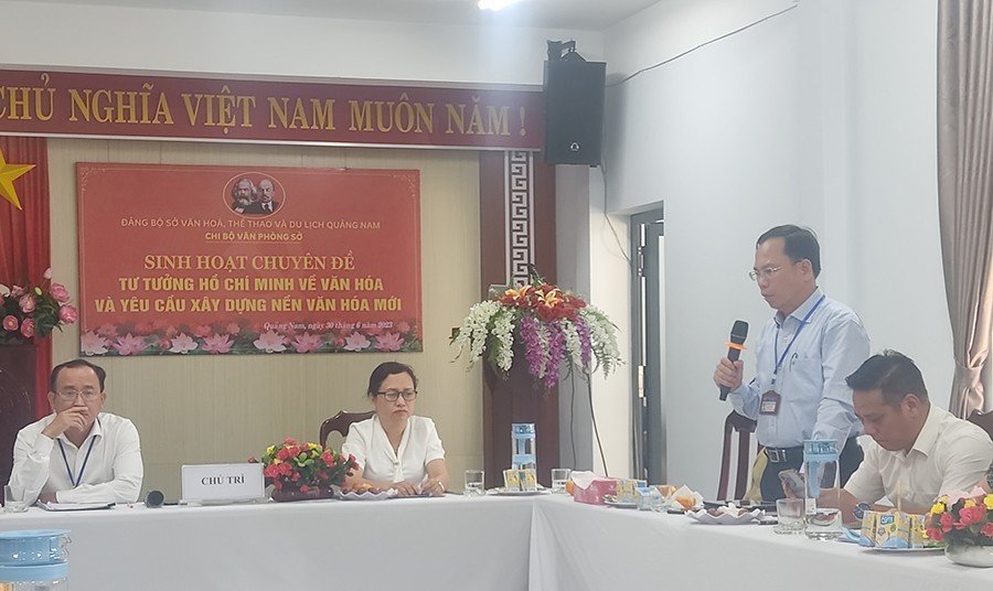 Các đồng chí Lê Bá Vương, UVBTV Đảng ủy Sở, Bí thư Chi bộ và Ngô Thị Liên Hương, Phó Bí thư Chi bộ Văn phòng Sở chủ trì buổi Tọa đàm. Về tham dự, có đồng chí Nguyễn Trọng Lĩnh, Phó Trưởng ban Tuyên giáo Đảng ủy Khối các cơ quan tỉnh; đồng chí Nguyễn Thanh Hồng, Tỉnh ủy viên, Bí thư Đảng ủy, Giám đốc Sở; đồng chí Tào Viết Hải, Phó Bí thư Đảng ủy, Phó Giám đốc Sở; đồng chí Văn Bá Sơn, UVBTV, Phó Giám đốc Sở; đại diện lãnh đạo một số Chi bộ trực thuộc Đảng bộ Sở và toàn thể đảng viên Chi bộ Văn phòng Sở. Thay mặt cấp ủy chi bộ, đồng chí Ngô Thị Liên Hương, Phó Bí thư Chi bộ Văn phòng Sở trình bày báo cáo đề dẫn “Tư tưởng Hồ Chí Minh về văn hoá và yêu cầu xây dựng nền văn hoá mới”. Báo cáo khẳng định: Chủ tịch Hồ Chí Minh là nhà tư tưởng vĩ đại, toàn bộ di sản tư tưởng của Người là một kho báu văn hóa của dân tộc Việt Nam, trong đó tư tưởng của Người về văn hóa chiếm một vị trí hết sức quan trọng; đó là một hệ thống các quan điểm lý luận mang tính khoa học, cách mạng về văn hóa và xây dựng nền văn hóa Việt Nam được kết tinh và chắt lọc những giá trị cả văn hóa phương Đông, phương Tây, của truyền thống và hiện đại, của dân tộc và quốc tế. Theo Hồ Chí Minh, văn hóa có ý nghĩa vô cùng to lớn và giữ vị trí đặc biệt quan trọng: Văn hóa là một kiến trúc thượng tầng; những cơ sở hạ tầng của xã hội có kiến thiết rồi, văn hóa mới kiến thiết được và đủ điều kiện phát triển được; có thực mới vực được đạo; xã hội thế nào thì văn hóa thế ấy. Nhưng mặt khác, đến lượt mình, văn hóa là động lực của sự phát triển xã hội, phát triển kinh tế; văn hóa phải soi đường cho quốc dân đi...