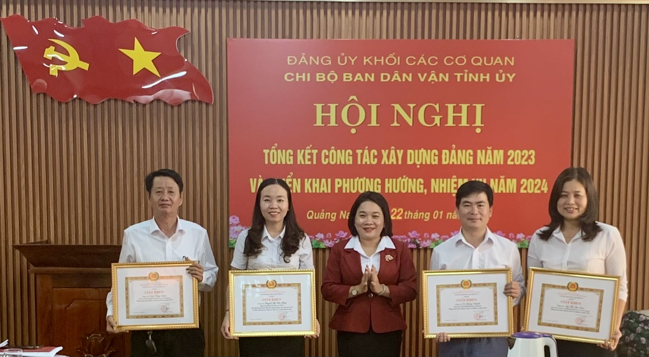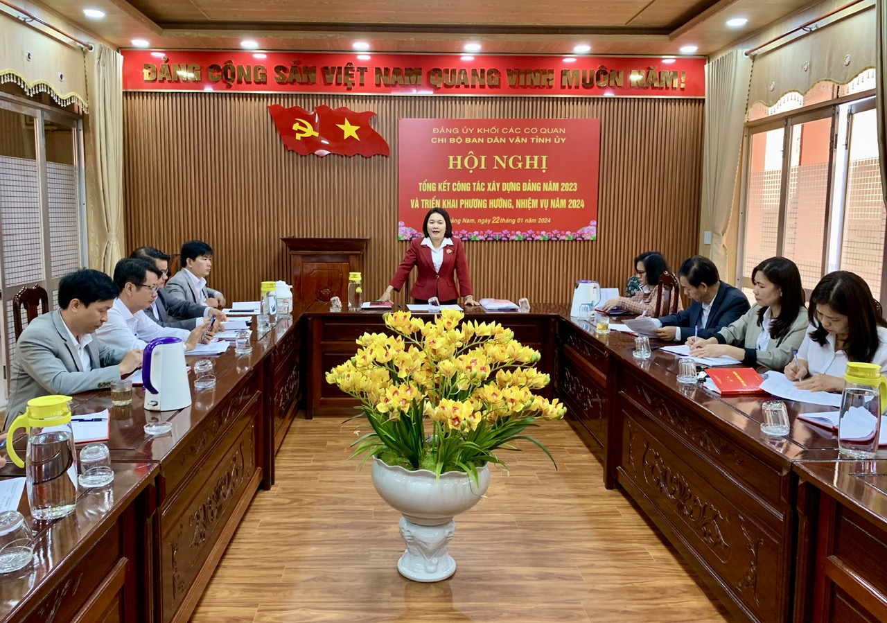 Bám sát sự chỉ đạo, hướng dẫn của Đảng ủy Khối các cơ quan tỉnh, năm 2023, Chi bộ Ban Dân vận Tỉnh ủy đã tập trung lãnh đạo thực hiện tốt công tác xây dựng Đảng; phối hợp với thủ trưởng cơ quan lãnh đạo thực hiện tốt nhiệm vụ chính trị đề ra. Tình hình tư tưởng của đảng viên, cán bộ, công chức an tâm, tin tưởng vào sự lãnh đạo của Đảng; gương mẫu trong công tác và sinh hoạt, năng nổ, nhiệt tình, trách nhiệm trong tham mưu đề xuất, hoàn thành tốt nhiệm vụ được giao; triển khai thực hiện Kết luận số 01-KL/TW, ngày 18/5/2021 của Bộ Chính trị về tiếp tục thực hiện Chỉ thị số 05-CT/TW và chuyên đề năm 2023, đặc biệt xây dựng, đăng ký và thực hiện thành công mô hình “Ngôi nhà Chi bộ”. Công tác tổ chức xây dựng Đảng, bảo vệ chính trị nội bộ, giới thiệu, quản lý đảng viên công tác giữ mối liên hệ với cấp ủy nơi cư trú theo Quy định số 213-QĐ/TW... được thực hiện có hiệu quả; bên cạnh đó, tổ chức sinh hoạt thường kỳ đảm bảo đúng định kỳ, nâng cao chất lượng các buổi sinh hoạt, nhất là việc tổ chức sinh hoạt chuyên đề. Công tác kiểm tra, giám sát thường xuyên và chuyên đề cơ bản đảm bảo được mục đích, yêu cầu đề ra. Lãnh đạo tổ chức đoàn thể của cơ quan thực hiện theo chức năng, nhiệm vụ, trọng tâm là tổ chức thành công Đại hội Công đoàn cơ quan, nhiệm kỳ 2023-2028. Năm 2023, 100% đảng viên chi bộ được đánh giá, xếp loại hoàn thành tốt nhiệm vụ, trong đó có 03 đồng chí được xếp loại hoàn thành xuất sắc nhiệm vụ. Tại Hội nghị, chi bộ đã thảo luận thông qua Nghị quyết về phương hướng, nhiệm vụ năm 2024 với 09 chỉ tiêu chủ yếu, 04 nhiệm nhóm nhiệm vụ, giải pháp trọng tâm và thông qua Chương trình công tác của chi bộ năm 2024. Phát biểu kết luận hội nghị, đồng chí Huỳnh Thị Thùy Dung, Bí thư Chi bộ ghi nhận, biểu dương những kết quả đã đạt được trong công tác xây dựng Đảng của chi bộ trong năm 2023. Đồng thời nhấn mạnh, năm 2024 là năm có ý nghĩa đặc biệt quan trọng để hoàn thành mục tiêu, chỉ tiêu đã đề ra tại Nghị quyết Đại hội Chi bộ nhiệm kỳ 2020-2025; đồng chí đề nghị tiếp tục xây dựng Chi bộ Ban Dân vận Tỉnh ủy vững mạnh gắn với nâng cao chất lượng đảng viên; chú trọng thực hiện mô hình “Chi bộ 4 tốt”, “Đảng viên 5 tốt”; lãnh đạo thực hiện tốt các nhiệm vụ chính trị năm 2024, qua đó, góp phần thực hiện thắng lợi Nghị quyết về phương hướng, nhiệm vụ năm 2024 của Đảng ủy Khối các cơ quan tỉnh.