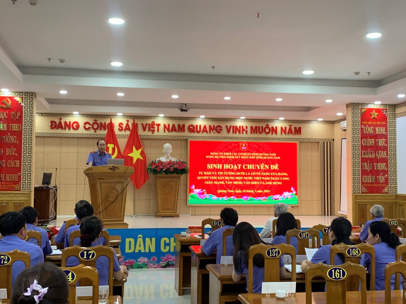 Tham dự buổi sinh hoạt chuyên đề có đồng chí Trần Hoài Nam - Bí thư Ban cán sự Đảng, Bí thư Đảng ủy, Viện trưởng VKSND tỉnh Quảng Nam; các đồng chí trong Đảng uỷ cùng toàn thể đảng viên VKSND tỉnh cùng tham dự. Phó Giáo sư, Tiến Sĩ Lê Văn Đính, Phó Giám đốc Học viện Chính trị khu vực III đã truyền đạt nội dung chuyên đề đến toàn thể đảng viên VKSND tỉnh Quảng Nam.