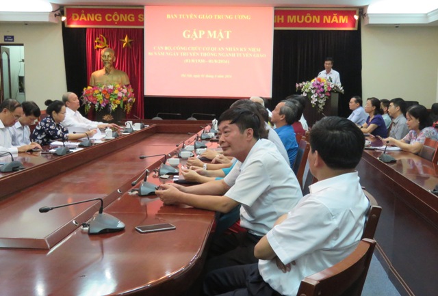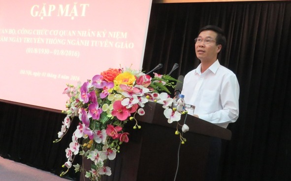Ngày 1/8/2016, tại Hà Nội, Ban Tuyên giáo Trung ương tổ chức gặp mặt cán bộ, công chức cơ quan nhân kỷ niệm 86 năm Ngày truyền thống ngành Tuyên giáo (1/8/1930 - 1/8/2016). Đồng chí Võ Văn Thưởng, Ủy viên Bộ Chính trị, Bí thư Trung ương Đảng, Trưởng Ban Tuyên giáo Trung ương dự và chủ trì buổi gặp mặt. Đồng chí Đinh Thế Huynh, Ủy viên Bộ Chính trị, Thường trực Ban Bí thư gửi lẵng hoa chúc mừng.