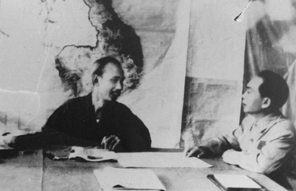 Đại tướng Võ Nguyên Giáp báo cáo tình hình chiến dịch Điện Biên Phủ với Chủ tịch Hồ Chí Minh. Ảnh tư liệu