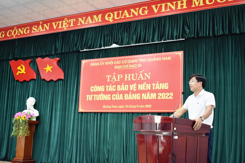 Phát biểu khai mạc chương trình tập huấn, đồng chí đồng chí Nguyễn Xuân Đức - Phó Bí thư Đảng ủy Khối, Phó Trưởng Ban Chỉ đạo 35 Đảng ủy Khối nhấn mạnh:“Công tác tư tưởng là một trong những nhiệm vụ trọng tâm trong công tác xây dựng Đảng; bảo vệ nền tảng tư tưởng của Đảng là nội dung cơ bản hệ trọng, sống còn trong công tác xây dựng, chỉnh đốn Đảng. Qua đợt tập huấn lần này nhằm thống nhất về nhận thức và bảo vệ nền tảng tư tưởng của Đảng, đấu tranh phản bác các quan điểm sai trái, thù địch trong tình hình mới trên không gian mạng; trang bị kỹ năng chuyên môn, nghiệp vụ, góp phần bảo vệ nền tảng tư tưởng của Đảng, giữ vững ổn định an ninh chính trị, trật tự an toàn xã hội ”.