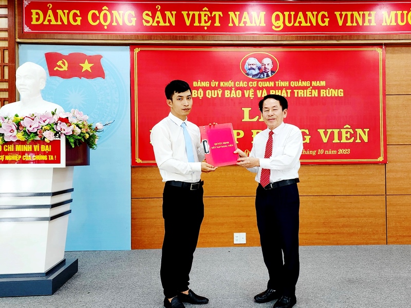 Đồng chí Huỳnh Đức - Bí thư Chi bộ, Giám đốc Quỹ Bảo vệ và Phát triển rừng tỉnh Quảng Nam đã trao Quyết định kết nạp Đảng cho đồng chí Lê Anh Nin.