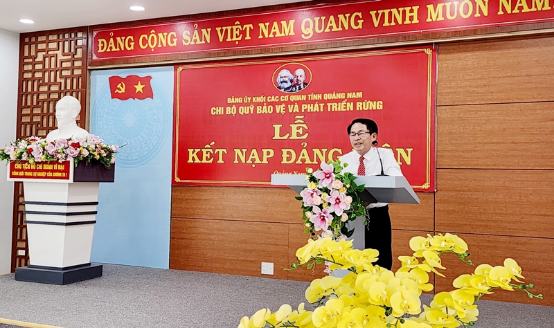 Đồng chí Huỳnh Đức - Bí thư Chi bộ, Giám đốc Quỹ Bảo vệ và Phát triển rừng tỉnh Quảng Nam phát biểu chúc mừng, giao nhiệm vụ cho đảng viên mới
