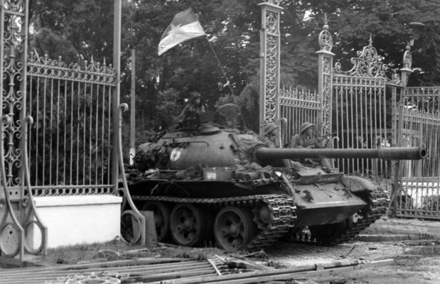 Xe tăng quân Giải phóng tiến vào chiếm Dinh Độc Lập, trưa 30/4/1975. (Ảnh: TTXVN)